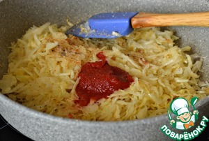 Добавить в сковороду с капустой томатную пасту, сахар, немного посолить, добавить воду, перемешать. Огонь убавить до умеренного, закрыть сковороду крышкой и тушить капусту до мягкости.