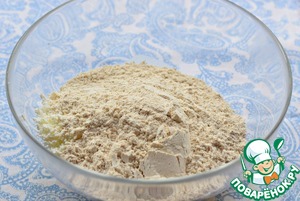 Просеять оба вида муки с разрыхлителем и всыпать муку к жидким ингредиентам. Замесить тесто.