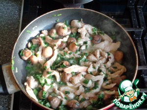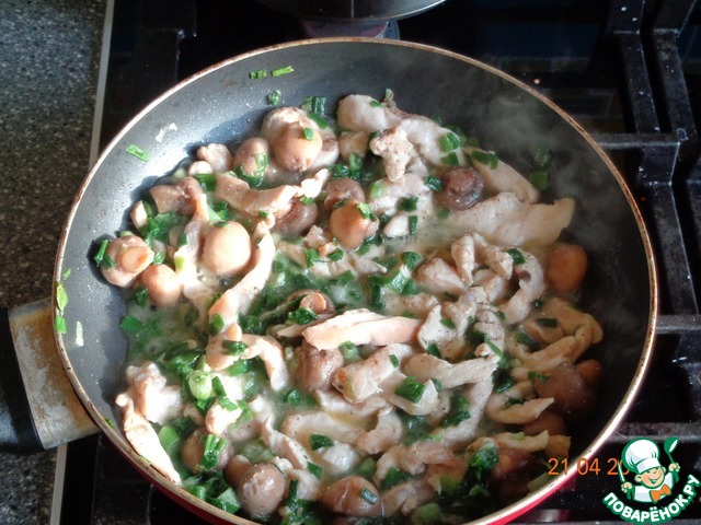 К филе добавляем шампиньоны и зеленый лук. Даем прокипеть 3 минуты.