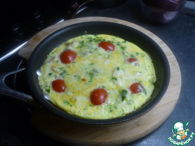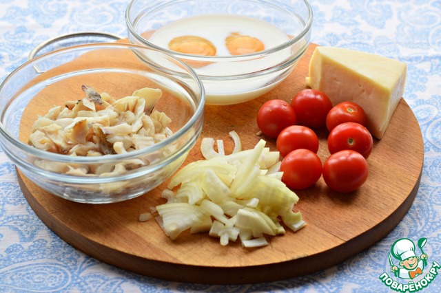 В молоко вбить яйца, лук нарезать четверть кольцами, сыр натереть на терке, черри разрезать пополам.