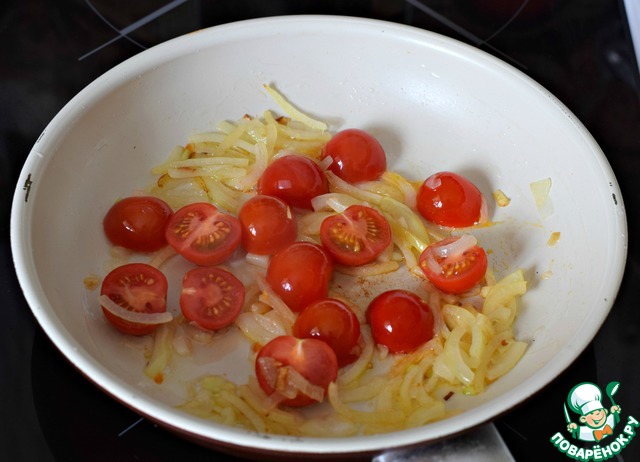 Добавить в сковороду черри (или обычный помидор, нарезанный кусочками). Обжаривать, помешивая, минутку.