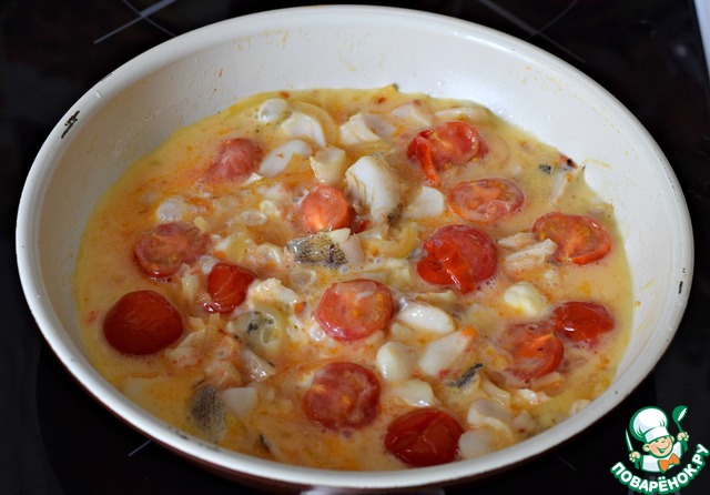 Яйца с молоком взбить венчиком или вилкой, посолить. Залить овощи и рыбу яично - молочной смесью.