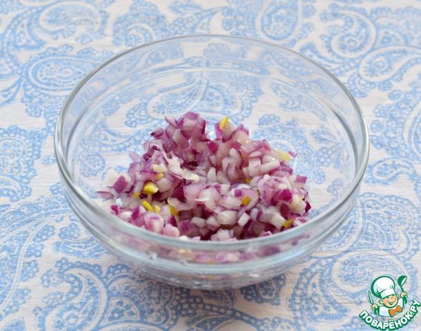 Лук измельчить, обдать кипятком, чтобы ушла лишняя резкость, отжать.