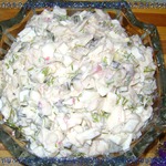 Выложить все ингредиенты в большой салатник, добавить измельченный укроп, заправить сметанным соусом, перемешать. Попробовать на соль. Посолить при необходимости.