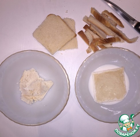 Срежем с хлеба корки и быстро обмакнем его в молоко. Отожмем.