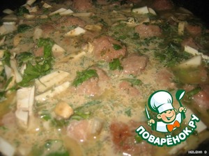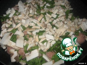 Из готового фарша формируем фрикадельки (в них я ничего кроме лука и морковки не добавляла, т.к. много приправы в подливе), немного их обжарила на раст. масле и добавила мелко нарезанные шампиньоны и нашинкованную зелень сельдерея, тушим минут 15.