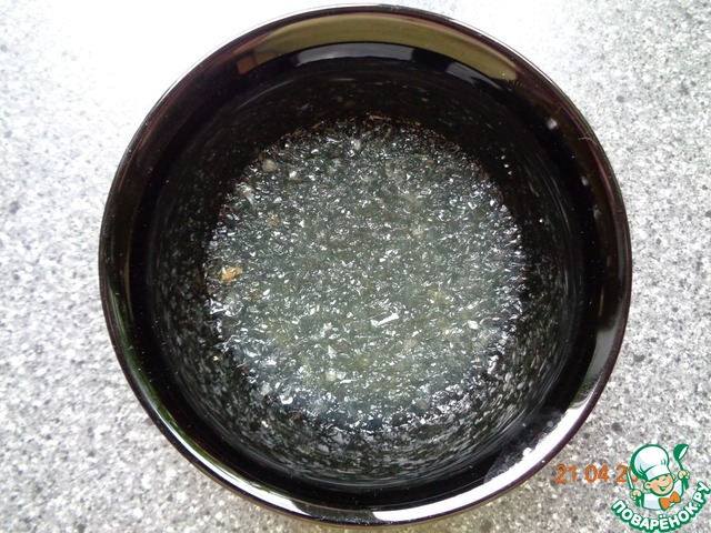 Готовый бульон нагреваем, добавляем набухший желатин и постоянно помешивая доводим до кипения, не кипятим. Полученное желе процедим, остудим.