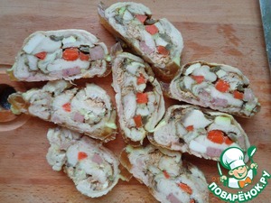 Духовку поставим разогреваться до 180 градусов. Приготовим рулет: свинину, ветчину и морковь порежем брусочками. Филе куриное распластаем (разрезать по толщине, вдоль не дорезая до края), посыпаем приправой и отбиваем. Подготовим фольгу (как вариант - пакет для запекания, пекарская бумага). На фольгу, немного внахлест, разложим филе - получим прямоугольник, по филе распределим половину нормы желатина (5 г.). Далее на филе равномерно кладем брусочки свинины, ветчины, моркови и грибы, затем по всей площади заготовки рулета рассыпаем оставшийся желатин (5 г.), посолим. С помощью фольги плотно скрутим рулет и упакуем его в два слоя фольги. Выпекаем в духовке 45 минут при температуре 180 градусов. Рулет остужаем под прессом в холодном месте. Я кладу на рулет разделочную доску, на доску кирпич. На формирование рулета уходит часов 8. Вот что получается.