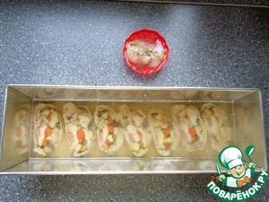 Уложим кусочки рулета в подготовленную форму. Формы можно использовать и маленькие, для каждого кусочка рулета отдельно.