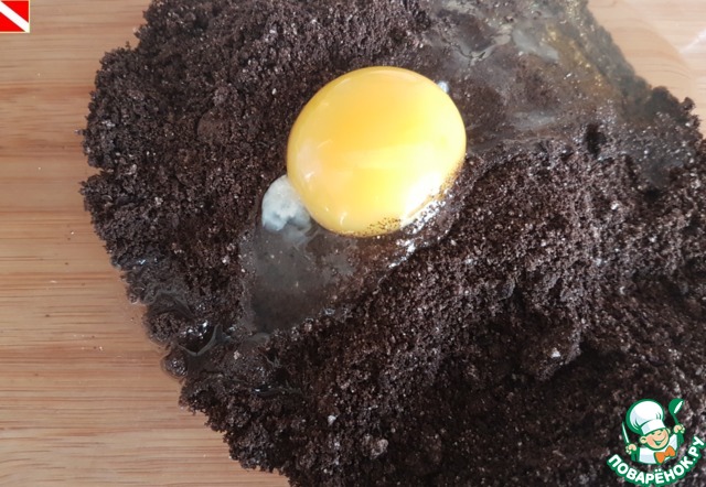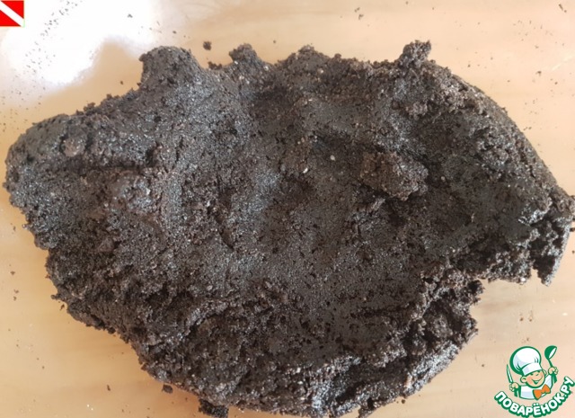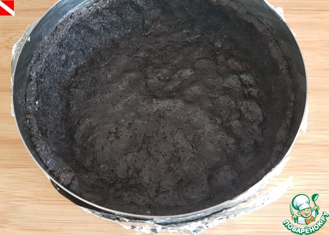 Его нужно распределить по дну и бортикам формы. На это количество ингредиентов использую кольцо диаметром 18 см, дно формирую из фольги.