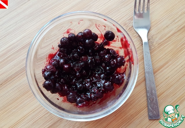 Готовый чизкейк необходимо остудить до комнатной температуры. Пока он остывает, займемся глазурью. Размороженную черную смородину помять вилкой так, чтобы примерно 50/50 было ягод и пюре.