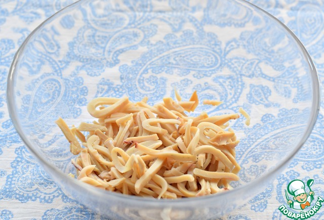 С консервированного кальмара слить жидкость, нарезать соломкой. Выложить в салатник.
