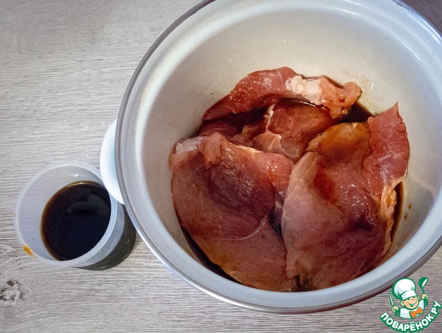 Соевый соус смешиваем 50/50 с ананасовым сиропом. Выкладываем первый слой мяса, поливаем соусом, второй - поливаем и. т. д. Убираем в холодильник на 40-60 минут или вплоть до суток, как вам удобно.