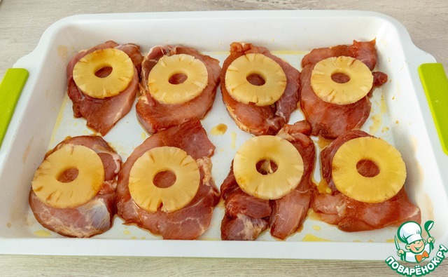 Затем мясо выкладываем на форму/противень смазанный растительным маслом, сверху кладем колечко ананаса и поливаем каждый кусочек буквально столовой ложкой нашего соуса (поверх ананаса). Убираем в разогретую до 180 градусов духовку на 30 минут.