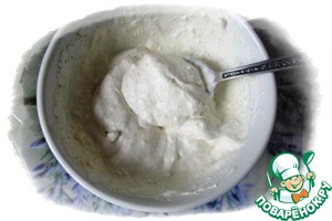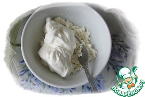 Первым делом делаем заправку. Фету разминаем в мисочке вилкой и добавляем сметану