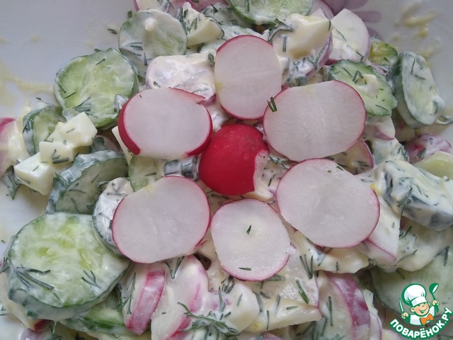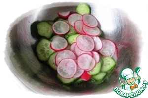 В миску нарезаем огурец и редис тоненькими кружочками. Можно использовать специальную терку, можно нарезать ручками.