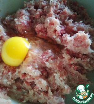 В фарш (я использовала свино-говяжий и филейно-куриный) разбиваем яйцо, добавляем соль, специи (для фарша) и тщательно перемешаем. -