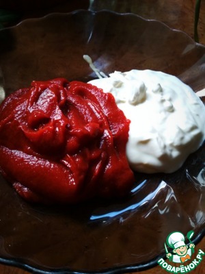 Теперь приступаем к нашему соусу: смешаем томатную пасту, сметану, воду. Добавляем по вкусу соль, черный молотый перец. Перемешать.