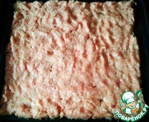 Смазав противень растительным маслом, укладываем первый слой - мясную основу. -