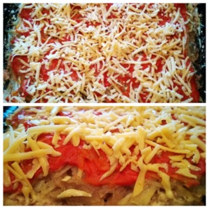 А теперь очень важный момент: за 10 минут до полного приготовления, достаем запеканку и посыпаем сверху тертым сыром.