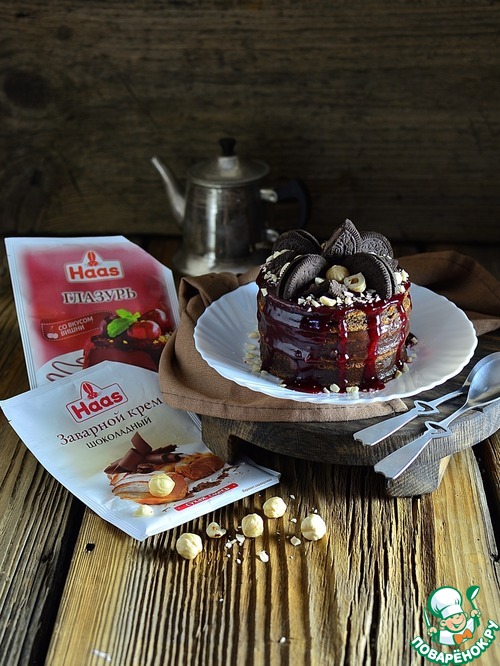 Полить тортик глазурью и украсить верхушку по желанию - у меня шоколадные печенья с прослойкой и поджаренный фундук.