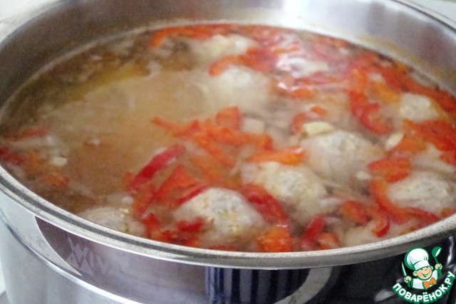 Замечательный суп! Обжаренное пшено придало фрикаделькам и бульону интересный и яркий оттенок вкуса. Перца у меня не было, натёрла две небольшие помидорки.