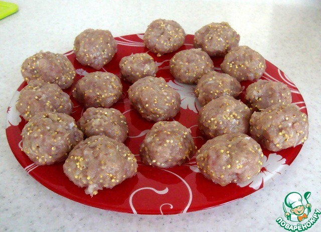 • В фарш добавить соль, перец и пшено. Хорошо перемешать и сформировать фрикадельки.
