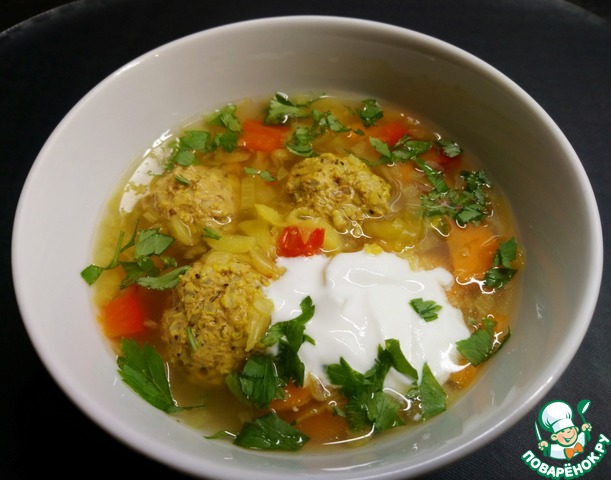Хочу предложить вашему вниманию суп с фрикадельками, в которые добавлено пшено. Суп получается диетический, так как фарш состоит из курицы и индейки, а готовится без обжаривания овощей. Так сказать, легкий суп.