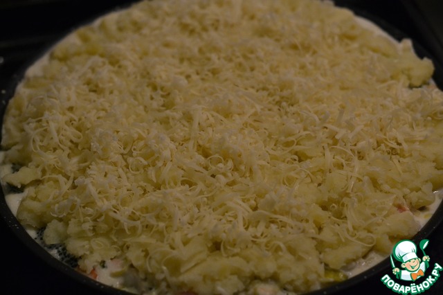 Сверху выкладываем слой картофельного пюре. Разровнять лопаткой