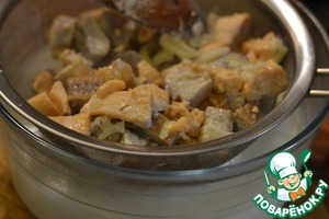 Откинуть рыбу на дуршлаг, слить молоко. Оставить остывать.