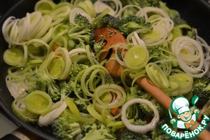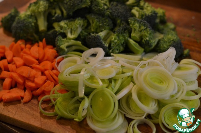 Лук-порей и морковь нарезать колечками. Брокколи разобрать на соцветия.