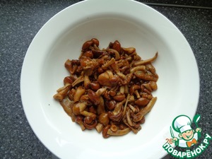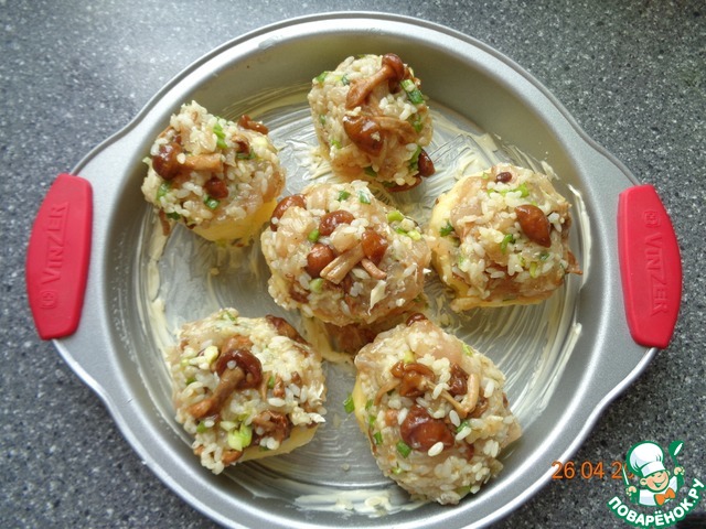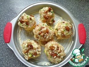 • Соединим ингредиенты для начинки: рис, куриное филе, опята, чеснок, зеленый лук.