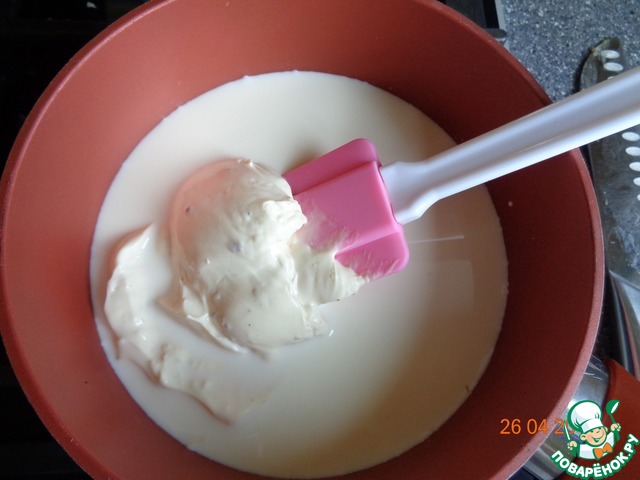 Сделаем соус: в сливки кладем мягкий сыр и нагреваем до растворения сыра, постоянно помешивая.