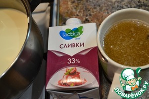 • Подготовить ингредиенты, залить кипяченой охлажденной водой желатин. Ставим на огонь сливки с добавлением молока, доводим массу до кипения, но ни в коем случае не кипятим, добавить сахар. Снимаем с огня сотейник, выливаем в него набухший желатин, хорошо все перемешиваем до полного растворения.