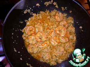 В сковороду с небольшим количеством разогретого подсолнечного масла выкладываем рыбу, обжариваем, добавляем креветки.