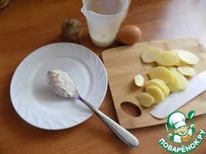 Сначала сделаем основу запеканки. Готовим продукты. Картофель нужно нарезать тонкими слайсами.