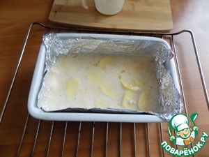 В мерной кружке соединила тёплое молоко, муку и соль вилкой. Для запекания взяла форму керамическую и застелила её фольгой. Фольгу промазала маслом оливковым.