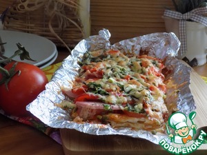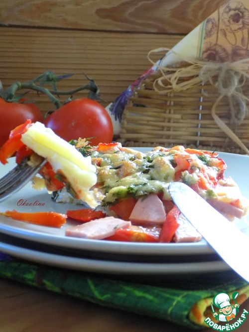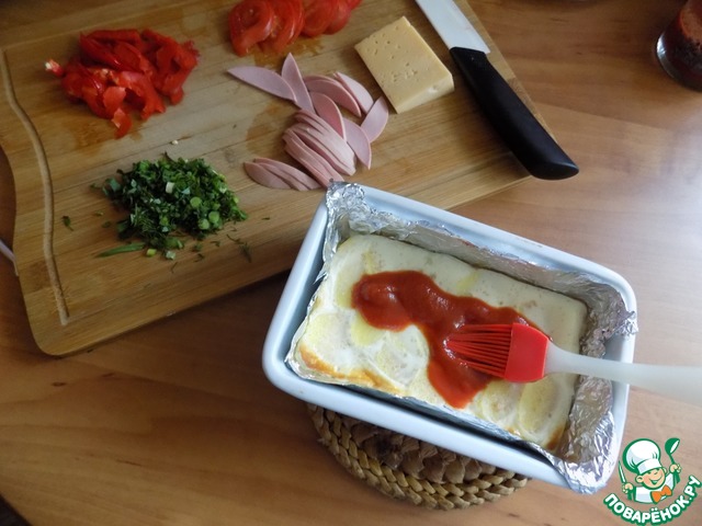 Всё для запеканки режем произвольно. Вынимаем схватившуюся основу из духовки. Промазала верх её я протёртыми томатами. можно заменить на томатный соус. Тем, кто ест кетчуп, можно промазать им.