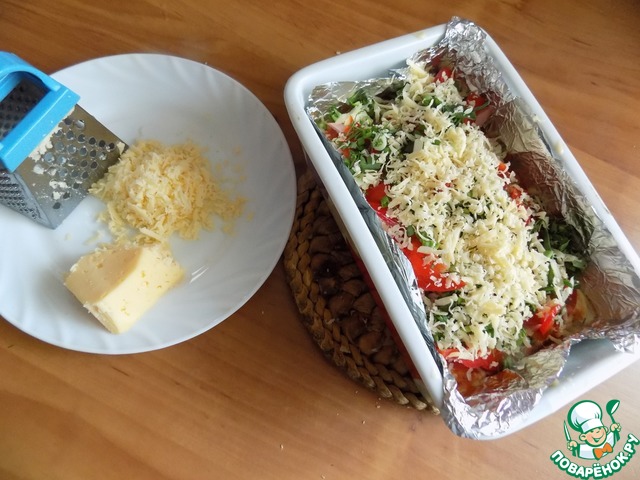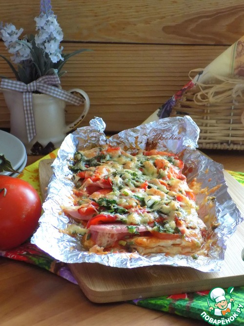 Укладываем все составляющие запеканки слоями произвольно. Я укладывала так: на томаты протёртые-помидор-ко лбасу-перец болгарский-зелень-сыр. Ставим в духовку опять при т-180 С. У меня запеканка делалась ещё 12-15 минут.