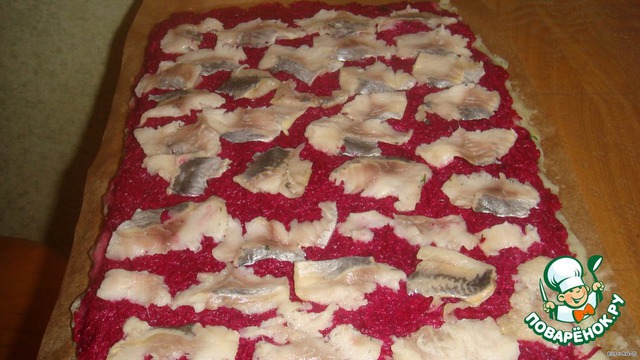 Филе сельди нарежьте на тоненькие дольки и выложите на всю поверхность свеклы.