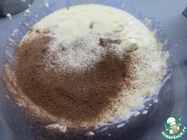 ~ в другой ёмкости смешать: 4 желтка, творог 400 г., сметану 100 г., варенье 3 ст. л., 1 ст. л. манной крупы, 1 ст. л. черёмуховой муки. Добавлять ингредиенты по очереди. Последней ввести соду 0,5 ч. л. -