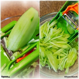 Вот эта овощечистка – очень удобный девайс. И универсальный. Вставляется в станину, можно вот так. И тогда получается вот такая симпатичная соломка. Как Катя и обещала – мелко!