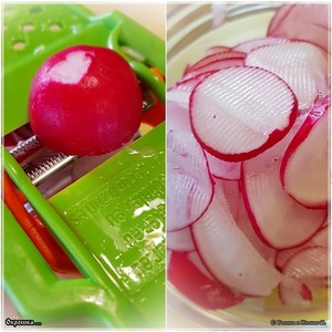 Редиска. Это уже, что называется, необязательное дополнение. У нас в семье не все ее любят, поэтому настрогать-то мы ее настрогали, но в отдельную плошку.