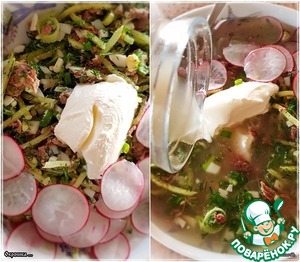 Ну, вот. Сметанки туда, сколько душа пожелает. Редиски упомянутой, если кто любит, и заливаем квасом. Тем самым … ароматным, густым, ржаным квасом. Ох, он и, простите, ядреный!!!