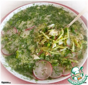 Зелень. Знаете, кроме укропа ничего другого не надо. Там в квасе есть еще травка волшебная. Мята деревенская. Букет получается – ну, очень приятно и вкусно!