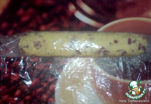 Выкладываем массу на пищевую пленку и придаем форму колбаски. У меня получилось 2 такие колбаски (вторая потолще). Кладем в морозилку на час.