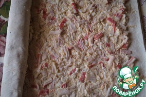 Накрываем сверху второй половиной лаваша. Смешиваем крабовые палочки, 2 яйца, твердый тертый сыр, заправляем майонезом смешанным с икрой мойвы (классическая или со вкусом креветок). Намазываем вторую половину лаваша и сворачиваем рулетом.