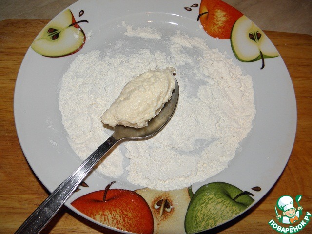 Обваливать в муке и формовать в ладонях шарик размером с грецкий орех. Тесто очень легкое в работе, как пластилин.