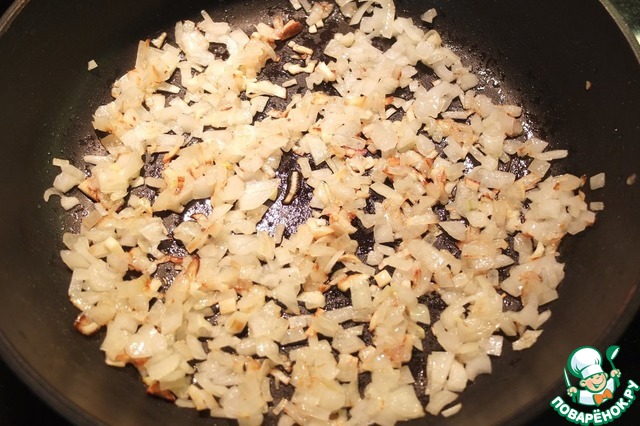 Для соуса мелко нарезаем лук и чеснок. Обжариваем в небольшом количестве растительного масла до золотистого цвета.