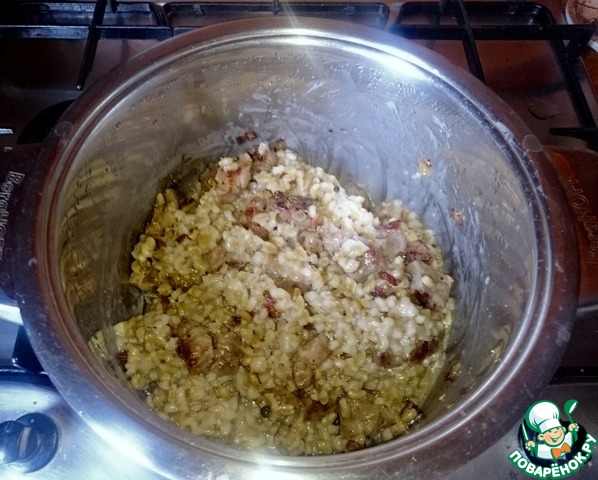 Готовое мясо перекладываем в кастрюлю с перловкой, перемешиваем.